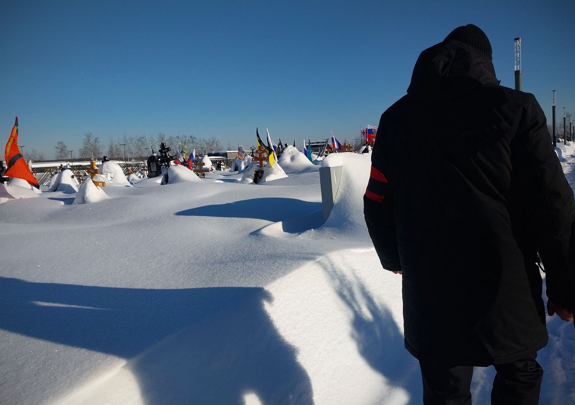 Finally, the hearse arrives and we go for the body. Our deceased is light, in a sealed bag – probably missing some body parts. We cover the coffin with a flag, quickly move it to the hearse, and head to Domodedovo Cemetery. The service will be held by the graves. Porter Andrey is surprised by the number of flags and starts filming them on his phone.