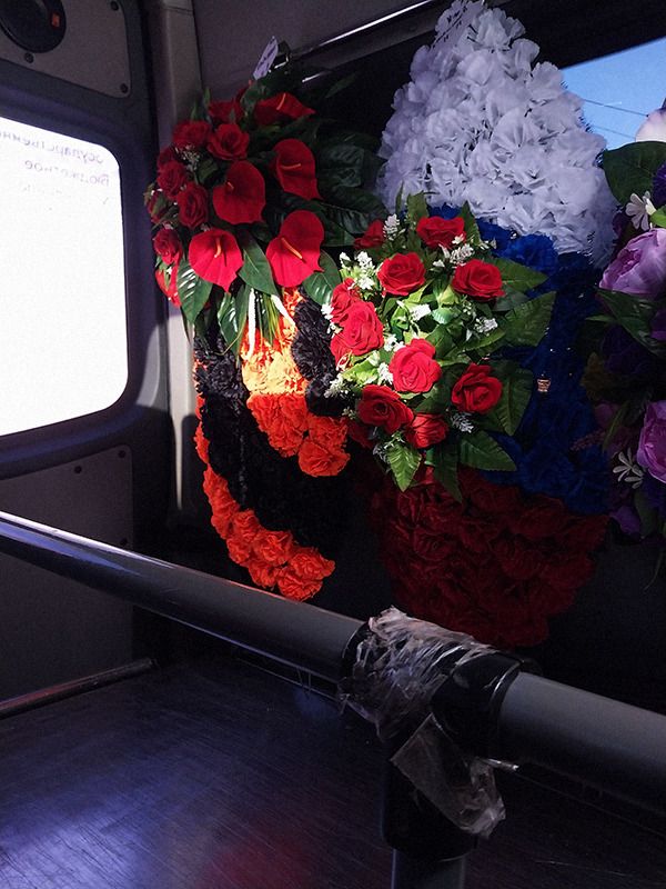 I don’t smell anything. Because the bus is speeding up and braking, we have to hold the coffin extra to keep it steady – it’s not wrapped very neatly with the Russian flag.