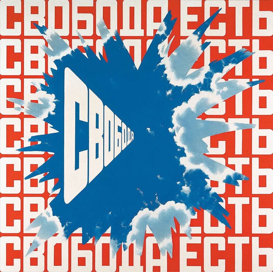“Freedom is Freedom is Freedom is Freedom is Freedom is Freedom is Freedom is Freedom is freedom” (2001) reproduces on canvas without cuts a poem by Vsevolod Nekrasov, Bulatov’s favorite poet. Written in white poster font on red, the text occupies the entire square canvas, seemingly torn in the center. And into this hole, inflating the hanging rags, the very freedom about which the artist recently said in an interview that for him it “was the original goal.”