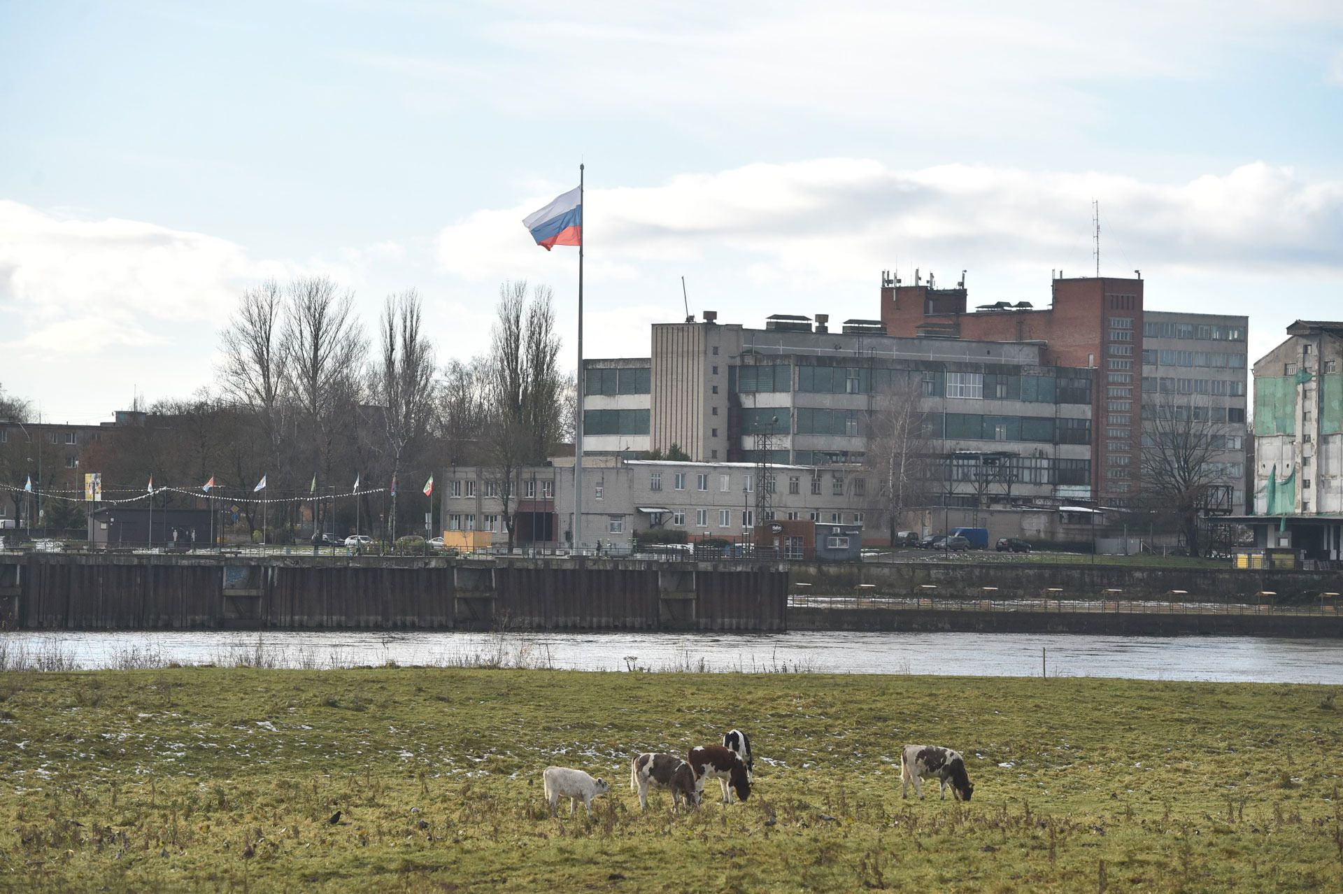 Above the Neman River on the Lithuanian side, the flags of Lithuania and Ukraine flutter from a tower. On the other side, attention is drawn by the Russian flag and a large letter Z on the wall of one of the houses — a symbol of Russian military aggression. It appeared opposite Panemune in autumn 2022.